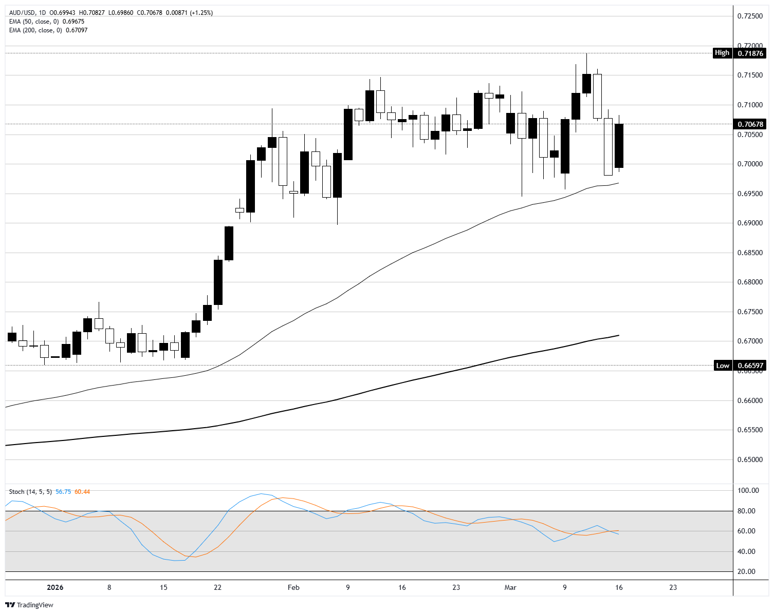AUD/USD gained around 1.25% on Monday, bouncing from last week's lows to settle around 0.7070. The pair has been in a choppy range since peaking near 0.7190 in early February, with price pulling back repeatedly toward the 0.7000 area before recovering. Monday's session closed near the middle of this range, with the daily candle's structure suggesting the move was driven by broad US Dollar weakness rather than fresh Australian Dollar buying conviction.