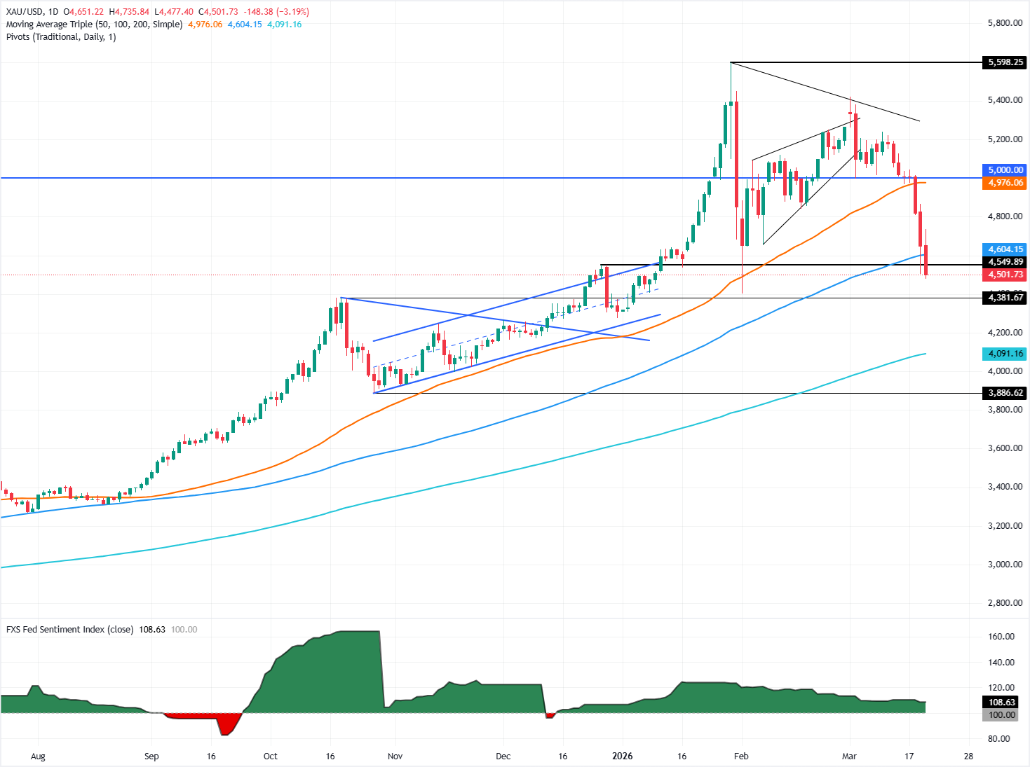 At the time of writing, XAU/USD trades at $4,560, down nearly 2% in the day. The US Dollar Index (DXY), which measures the buck's performance against a basket of six currencies, is up 0.43% at 99.58.